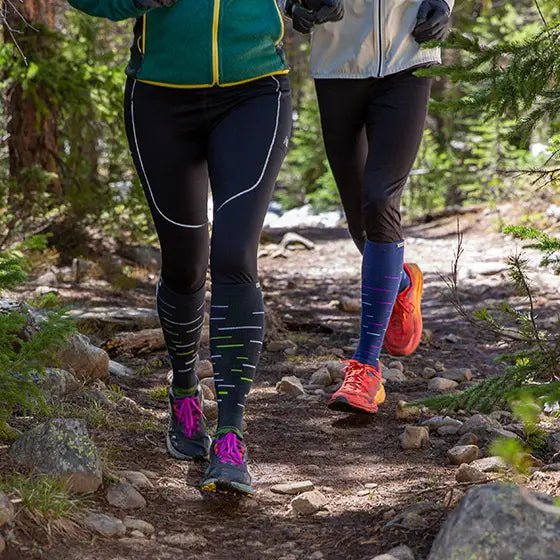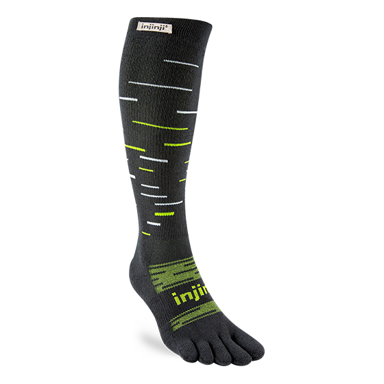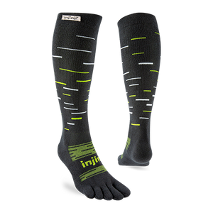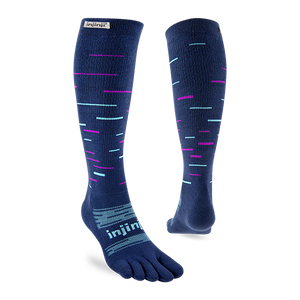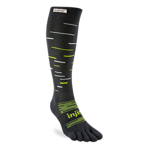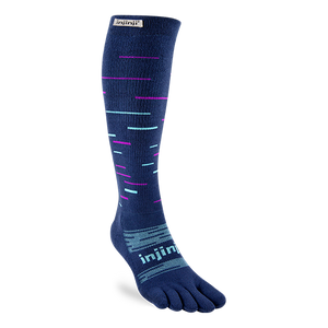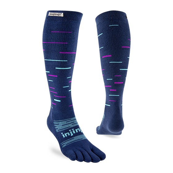 Take winter running and skiing to the next level with Injinji’s Snow Over the Calf Toesock. Optimized for warmth, comfort, and blister prevention, this tall winter sock is ideal for slopes or snowy trails. THERMOLITE® EcoMade threads use your body’s infrared energy to generate heat, while hollow fibers create an insulating layer. Toe and foot cushioning softens the impact of each step, and an anatomical fit supports total foot utilization.